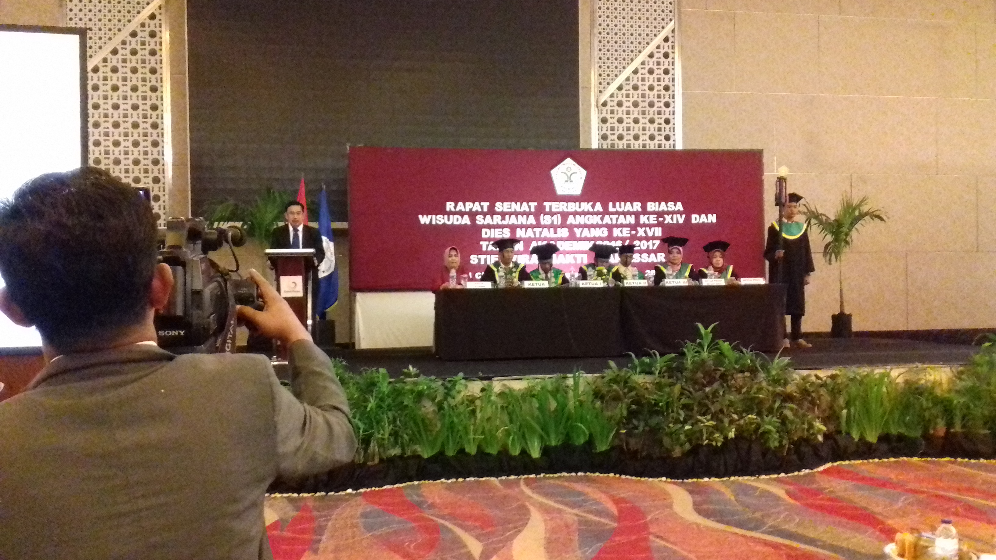 MAKASSAR, BERITA-SULSEL.COM - Sekolah Tinggi Ilmu Ekonomi (STIE) Wira Bhakti Makassar gelar wisuda di hotel Clarion, Sabtu, (29/7/2017).Room Phinisi mulai dipadati peserta wisuda sekitar pukul 08.00 meski acara secara resmi dimulai pukul 09.00. Sebanyak 376 Mahasiswa-mahasiswi akan diwisuda."Semoga 376 mahasiswa-mahasiswi yang diwisuda hari ini bisa menjadi sarjana yang berguna ditengah-tengah masyatakat," ujar ketua STIE Wira Bhakti Makassar, Abdul Rahman SE M.SiHadir dalam acara tersebut, Koordinator kopertis wilayah 9 Sulawesi, Prof Dr Ir A. Niartiningsih MP, Guru besar Umi, Prof Dr Natsir Hamzah SE M.Si, Kabid Fasilitas PAUD, Dikdas, dikmas, dan dikti, Drs Ahmad Farumbian M.Pd mewakili Gubernur Sulsel dan ketua Yayasan Bhakti Bumi Persada, Drs H. Andi Mustaman MM.Guru besar UMI, Prof Dr Natsir Hamzah SE M.Si diberikan kesempatan menyampaikan orasi ilmiah dengan tema ; Peranan sistem ekonomi islam terhadap ketahanan ekonomi nasional dalam menghadapi masyarakat ekonomi asean.Dalam Orasinya Prof Natsir menyampaikan, ada dua pertarungan besar dalam sistem ekonomi, antara sistem ekonomi kapitalis dan sistem ekonomi sosialis tapi poros tengahnya adalah sistem ekonomi islam."Indonesia menganut sistem ekonomi pancasila, mengambil hal positif dari sistem ekonomi kapitalis dan sosialis tapi masih condong kepada sistem ekonomi kapitalis, ekonomi islam harus menjadi solusi ekonomi bangsa saat ini," jelasnya dihadapan ratusan wisudawan-wisudawati.